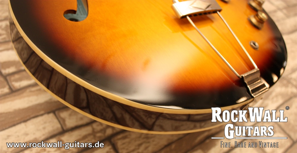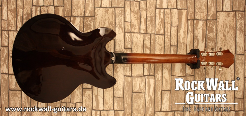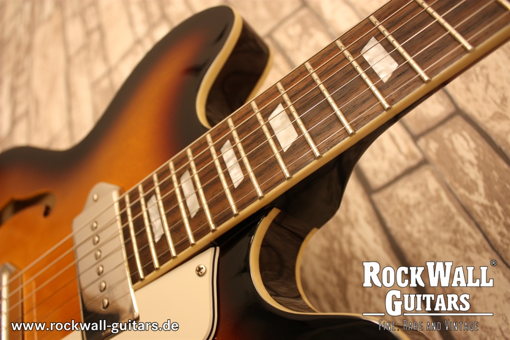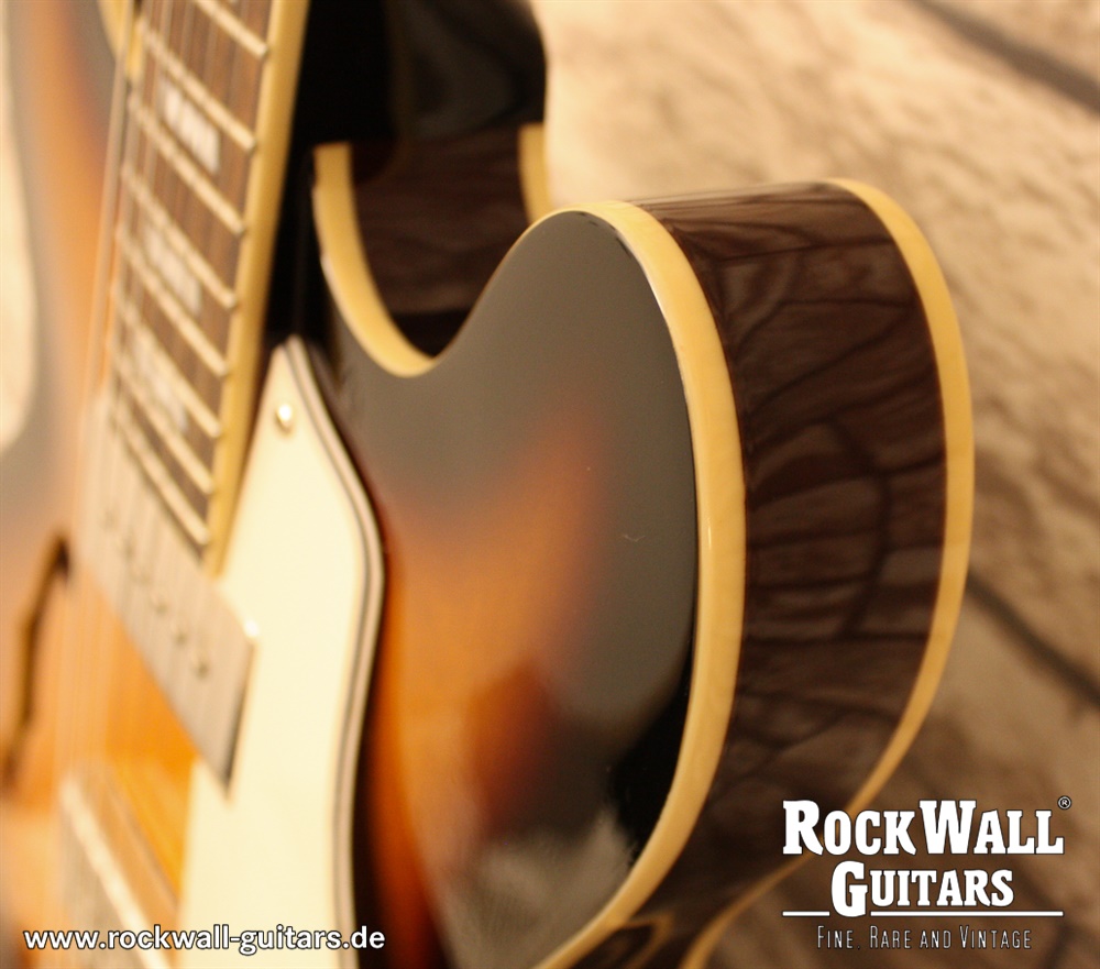 Sie verfügt über eine laminierte Ahorn-Decke, einen laminierten Ahorn-Boden und laminierte Ahorn-Zargen mit klassischem Sunburst-Finish und einem dünnen, komfortablen Halsprofil. Der Korpus ist vollständig hohl (ohne Mittelblock), was dem Instrument einen offenen, resonanten akustischen Charakter verleiht, der dynamisch auf Anschlag und Verstärkereinstellungen reagiert.