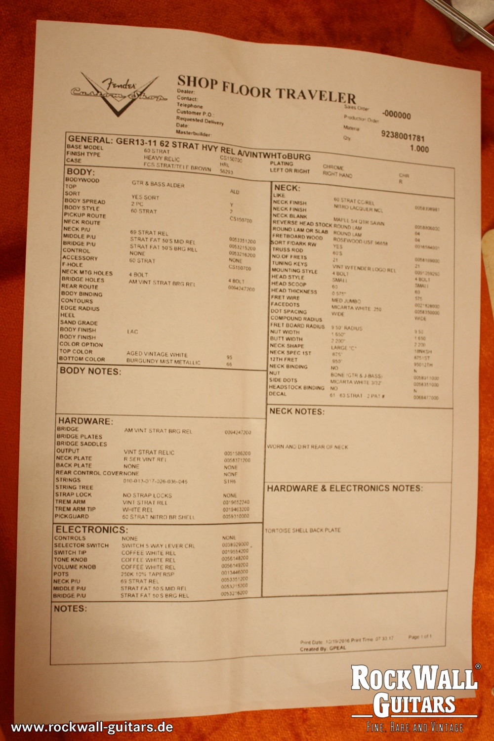 Zur Gitarre gibt es ein Zertifikat von RockWall Guitars und das original Fender Zertifikat.